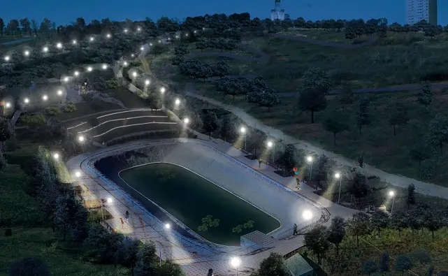 Проект нижней части парка — в центре пруд, возле него амфитеатр.