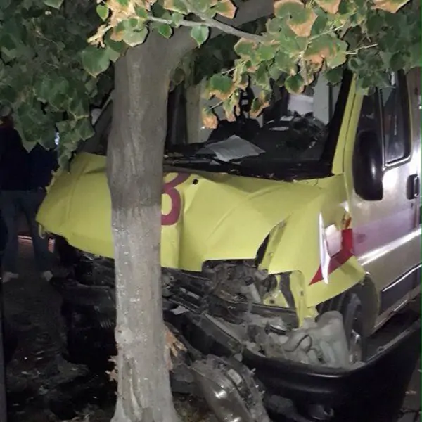 Произошло столкновение, после которого автомобиль скорой врезался в дерево. Если бы не это препятствие, машина медиков снесла бы павильон «Цветочная телега».
