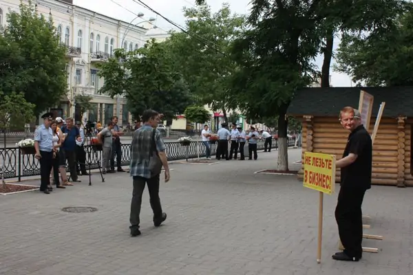 Далее активист обратился с речью ко всем собравшимся. Он рассказал, что действия администрации душат малый бизнес, причём страдают не только торговцы квасом, но и владельцы мобильных кофеен и шиномонтажек.