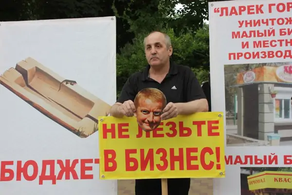 В воскресенье, 21 июня, в Ростове возле парка Горького состоялся одиночный пикет. Активист объединения квасников Ростова Герман Дрожжин, надев маску главы администрации Ростова Сергея Горбаня и взяв в руки транспарант «Не лезьте с бизнес!», выступил против решения администрации о продаже кваса только в специальных ларьках.