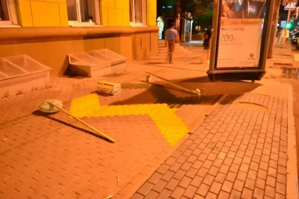 В ночь с 18 на 19 июня в Кировском районе Ростова на пересечении Ворошиловского и Пушкинской продолжился эксперимент с покраской тротуара — на него были нанесены жёлтые полоски.