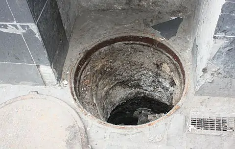 Возле первого люка ситуация повторяется — эксперты берут пробы воды, на вид она такая же мутная и жирная.