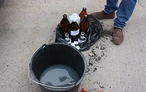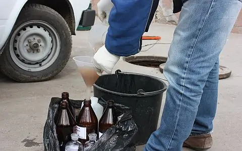 В ведре, куда сливаются стоки, видны частицы творога... Сотрудник водоканала разливает воду в колбы.