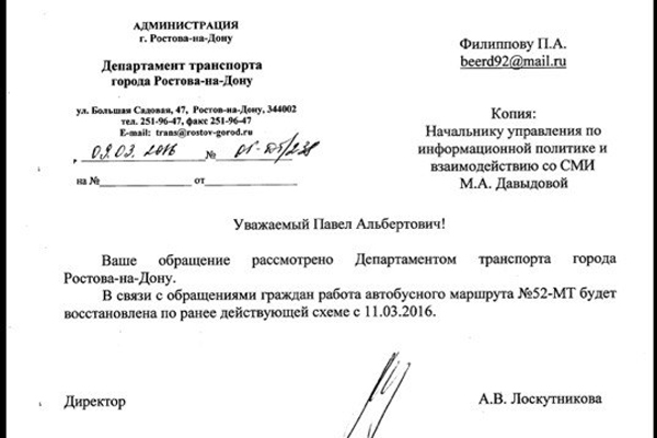Согласно ответу директора департамента Аллы Лоскутниковой, с 11 марта маршрутка № 52 будет курсировать по старой схеме.