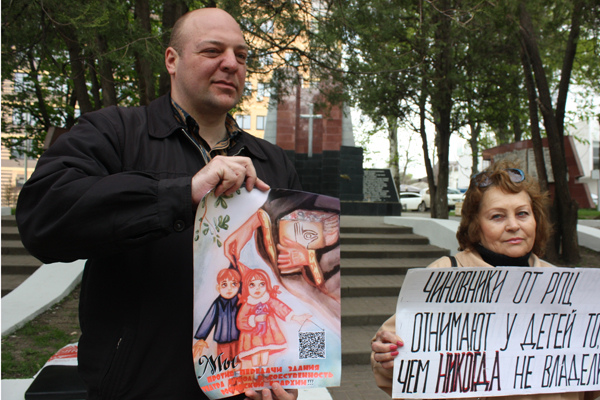 На пикете Марк Солопов представил плакат в защиту театра. Он выполнен на основе картины ростовской художницы Ольги Климовой. На написание картины её побудило то, как представители Ростовской епархии поступают с детьми.