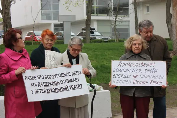 В субботу, 16 апреля, в ростовском парке Строителей состоялся пикет против передачи здания театра кукол имени Былкова Ростовской епархии. Помимо организаторов, а также нескольких представителей партий с флагами на пикет пришли ростовчане, которым небезразлична эта ситуация.