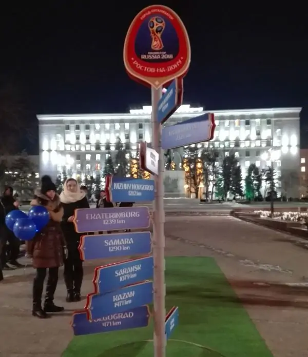 В Ростове на площади Советов 30 января в рамках празднования 500 дней до чемпионата мира по футболу 2018 года установили символический указатель расстояний до 10 городов-организаторов мундиаля. Отметим, что Ростовская область стала первым регионом России, установившим такой знак.