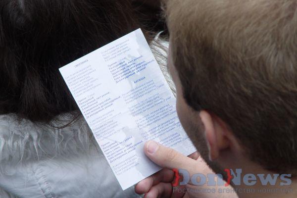 Официальное начало патриотической акции у ДГТУ было намечено на полдень. Студентам ВУЗа и преподавателям по такому поводу дали отгул, но повелели прибыть к 10 часам утра. Каждому входящему в оцепленный полицией периметр выдали флажок, браслет и небольшие листки с текстами песен, которые предстояло исполнить.