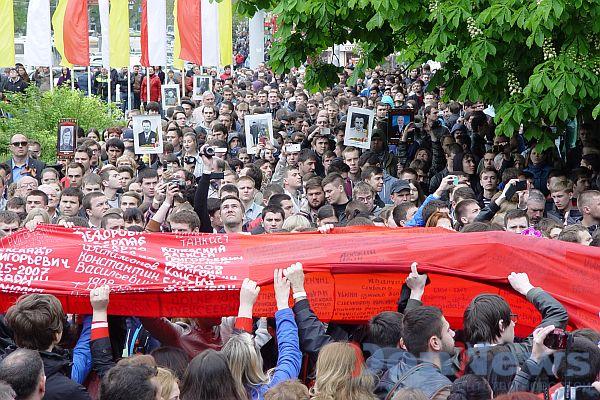 После второго исполнения «Дня Победы» над собравшимися поплыло Знамя победителей. В его создании участвовали почти две тысячи человек, каждый из которых подготовил лоскуток размером 30 на 42 см. Эти фрагменты содержат информацию о 5 тысячах воинов, погибших при освобождении нашей страны от немецко-фашистских захватчиков.