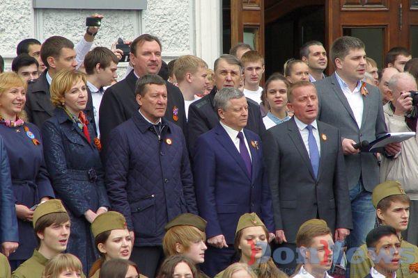 Ведущий начал разогрев студенческих голосовых связок за полчаса до официального начала мероприятия. Когда разминка завершилась, а на импровизированной сцене випы отговорили приветственные речи, над площадью грянул тухмановский хит всех времён и народов — «День Победы».
