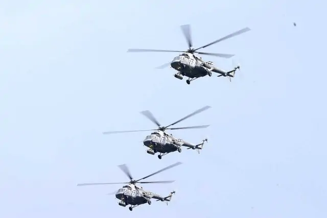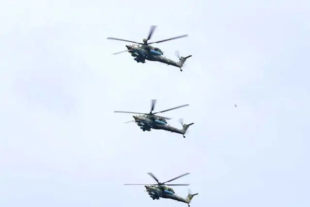 Также в воздух поднялось звено вертолётов огневой поддержки Ми-35, ударных Ка-52 «Аллигатор».