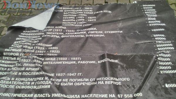 В Ленинском районе Ростова в парке Строителей неизвестные надругались над памятью миллионов людей, погибших в минувшее столетие в ходе политических репрессий. Негодяи разрисовали стенды мемориала «Невинно убиенным», сорвали два из них и залили краской плиту, на которой установлены крест и черепа.