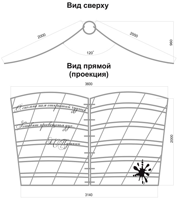 Однако главное, что заложено в проект, — это три так называемые малые архитектурные формы. Первая — инсталляция под названием «Тетрадь», которая должна быть сделана из нержавеющей стали и иметь высоту 2 метра, ширину в основании 3,1 метра и глубину чуть меньше метра. На «страницы» этой тетради должен быть нанесён отрывок из стихотворения Пушкина: «О, сколько нам открытий чудных Готовят просвещенья дух...».