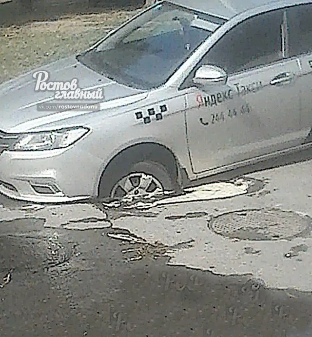В Ростове на Западном в субботу, 15 сентября, около 17:00 в яму на дороге провалилась машина такси, ехавшая по вызову. В соцсетях появились фото с места происшествия, на которых видно, что передняя часть иномарки частично ушла под землю.