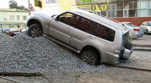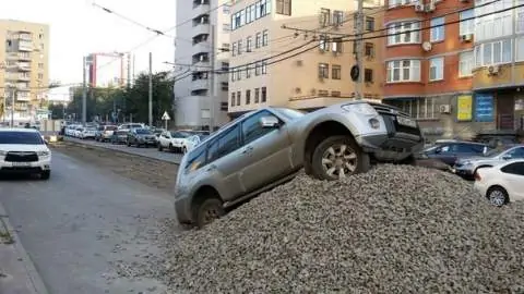 Ростовчане, оказавшиеся ранним утром 21 августа на пересечении улицы Горького и переулка Доломановского, были весьма удивлены необычно припаркованным внедорожником Mitsubishi Pajero. Видимо, владелец машины решил не заморачиваться с поиском свободного места и загнал своё авто на кучу щебня.