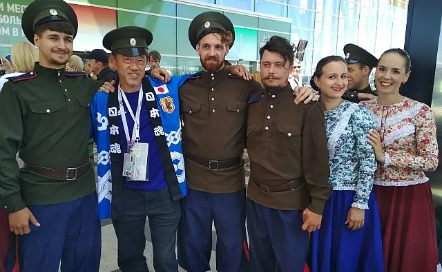 Японцы тоже не смогли пройти мимо веселья. Они с радостью бросались в пляс с казачками, пробовали подыграть музыкантам, фотографировались в фуражках и раздавали комплименты. Кроме того, болельщики из Японии без проблем вспомнили и напели мотив «Катюши».