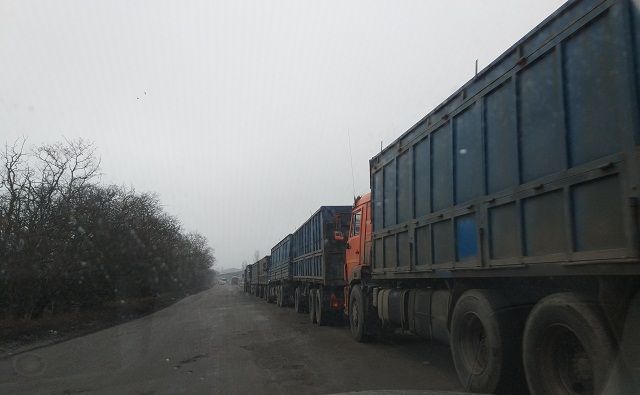 Стоянка камазов перед пунктом автоматического контроля, фото donnews.ru