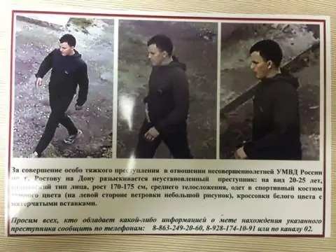 Как сообщили в пресс-службе главного управления МВД по Ростовской области, подозреваемому на вид 25-30 лет, тип внешности — славянский. Рост предполагаемого педофила — 170-175 сантиметров, телосложение среднее. Он был одет в спортивный костюм тёмного цвета (на левой стороне ветровки небольшой рисунок) и белые кроссовки с матерчатыми вставками.