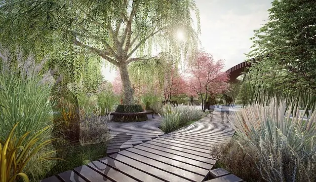 По проекту прогулочные зоны в парке будут вымощены не только привычной бетонной плиткой, но и белой гравийной крошкой, дополненной деревянными настилами из лиственницы. Деревянными будут и теневые навесы — перголы. Авторы проекта старались воссоздать атмосферу тихой тенистой заводи с мостками на берегу реки.