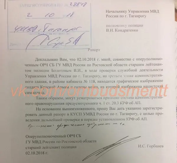 Двое оперуполномоченных службы собственной безопасности ГУ МВД по Ростовской области заподозрили своих таганрогских коллег в публичной демонстрации нацистской символики. Скан-копию соответствующего рапорта с датой составления от 2 октября 2018 года анонимно выложили в паблике «Омбудсмен полиции».