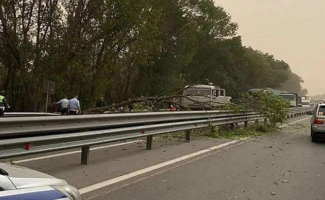 Сильный ветер повалил дерево на М4 «Дон» в районе посёлка Рассвет. Движение в сторону Москвы полностью перекрыто.