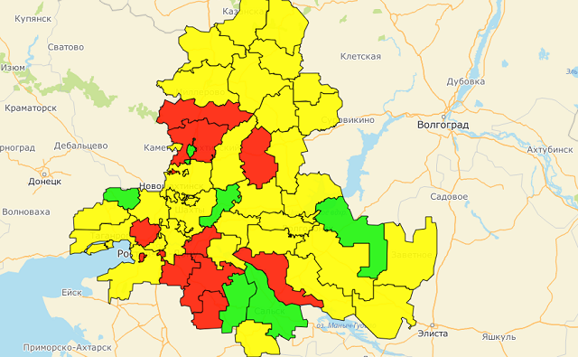 Среди неблагополучных по санэпидобстановке территорий оказались города Азов, Батайск и Гуково вместе с Багаевским, Егорлыкским, Зерноградским, Кагальницким, Каменским, Мясниковским, Пролетарским, Тарасовским и Тацинским районами.
