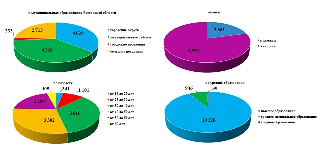 По состоянию на 30 июня 2018 года в Ростовской области работает 11,3 тысячи муниципальных чиновников. Из них 8,9 тысячи (около 80%) — женщины.