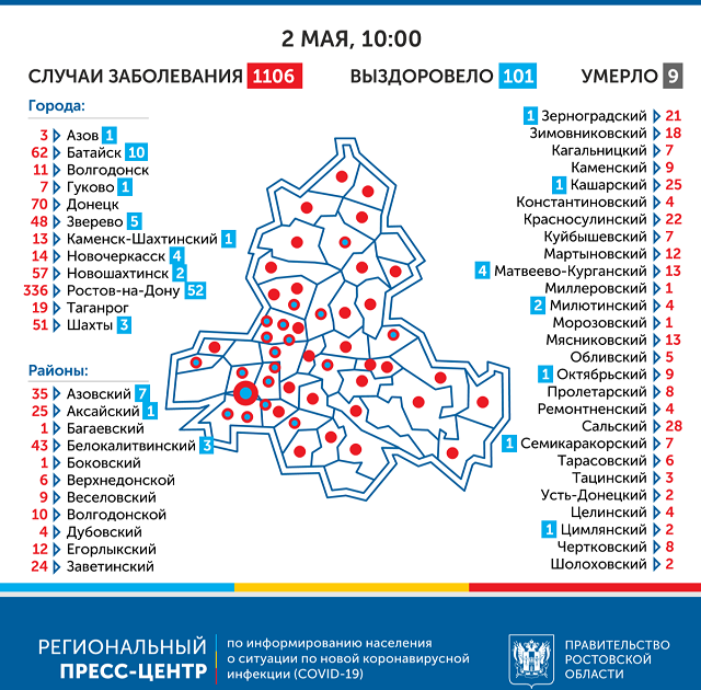 Больше всего новых случаев заражения выявлено в Ростове — 52. Ещё 10 человек заболели в Батайске, 7 — в Азовском районе, 5 — в Звереве, 4 — в Новочеркасске, 3 — в Шахтах и Белокалитвинском районе, 2 — в Новошахтинске и Милютинском районе, по одному в Азове, Гукове, Каменске-Шахтинском, а также в Аксайском, Зерноградском, Кашарском, Октябрьском, Семикаракорском и Цимлянском районах.