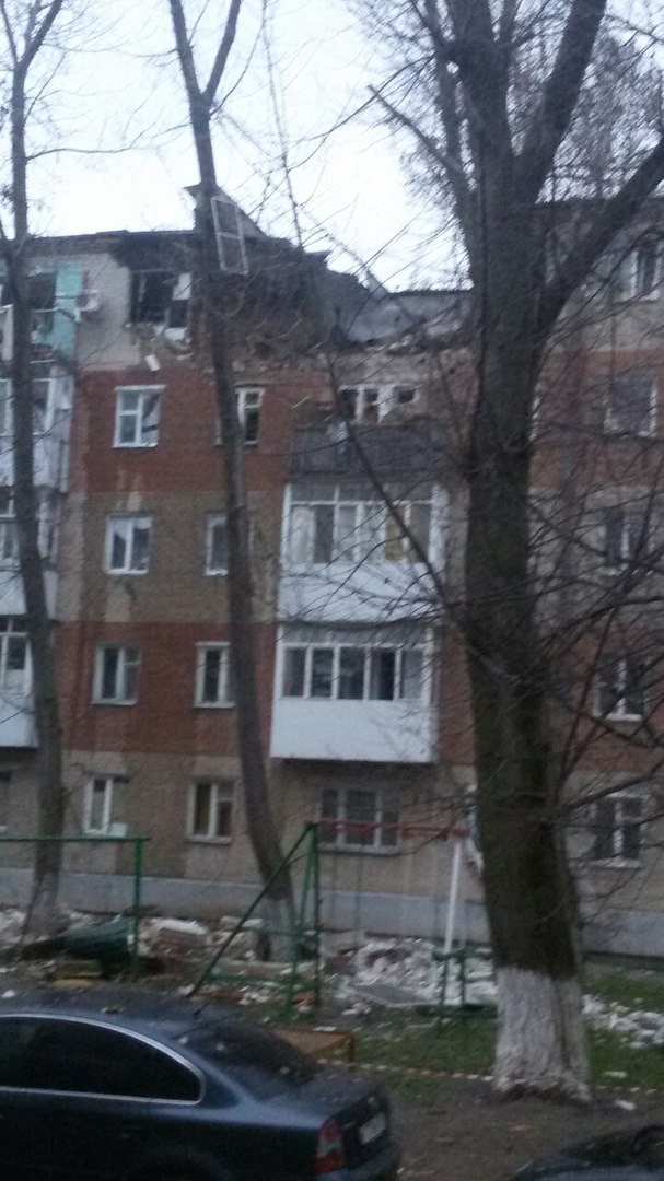 В результате взрыва повреждена внешняя стена дома на площади 20 квадратных метров, межкомнатные перегородки, нарушено остекление четырех квартир и произошло частичное обрушены перекрытия кровли.