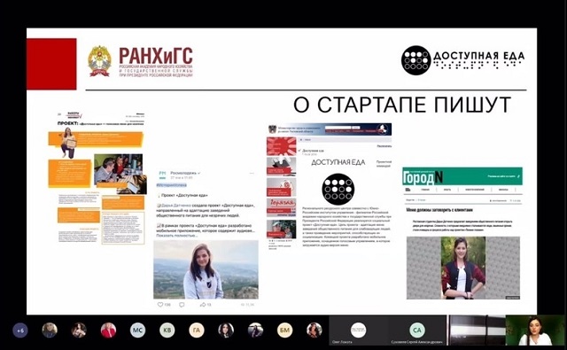 Первая защита в новом формате прошла в Президентской академии на минувшей неделе. Автором стартапа стала выпускница ЮРИУ РАНХиГС, член проектной команды «Столица Юга» Дарья Датченко. Студентка с вузовской командой в течение двух лет разрабатывала мобильное приложение «Доступная еда» — голосовое меню для слепых и слабовидящих людей.