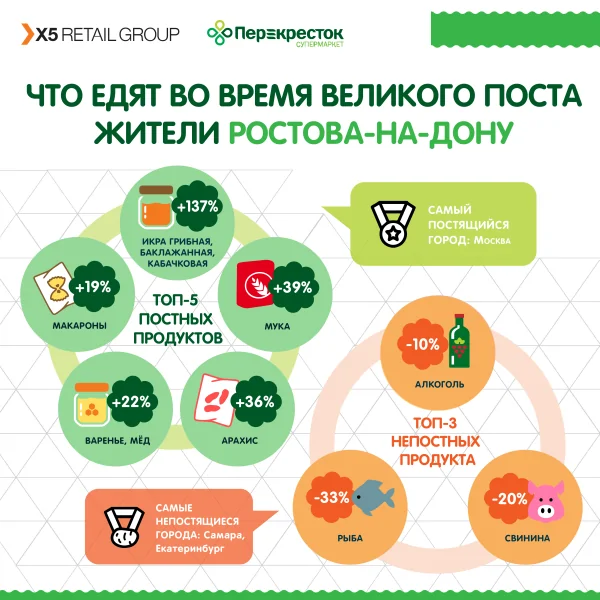 Аналитики торговой сети «Перекрёсток» выяснили, какие товары пользуются наибольшим спросом среди россиян в дни Великого поста, а также жители каких городов России чаще всего отказываются от непостных продуктов. Исследование основывалось на данных о продажах в сети супермаркета в 10 городах России — Москве, Санкт-Петербурге, Казани, Нижнем Новгороде, Самаре, Уфе, Перми, Челябинске, Екатеринбурге и Ростове.