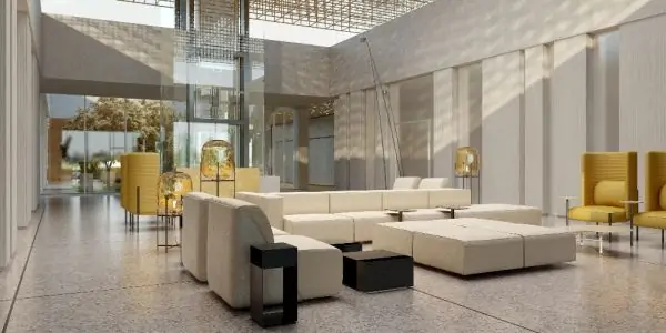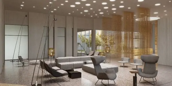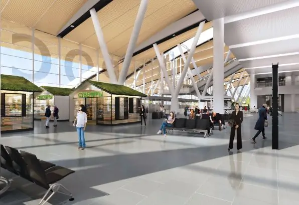 На первом этаже здания расположатся два конференц-зала, обеденная зона, залы ожидания и внутренний двор-сад, где пассажиры смогут отдохнуть перед вылетом.