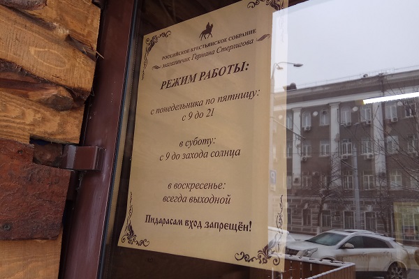 Интересно, что на кассе за 2000 рублей можно купить деревянные таблички с надписью «Пидарасам вход запрещён» и «Содомитам вход запрещён». Аналогичные надписи висят и на входе в магазин.