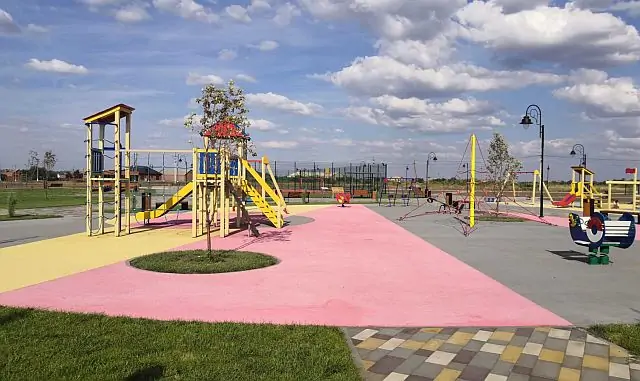 Главная аллея от фонтана ведёт к церкви, строительство которой планируют завершить в ближайшие несколько лет. Элементы традиционного орнамента можно увидеть и в раскладке тротуарной плитки.