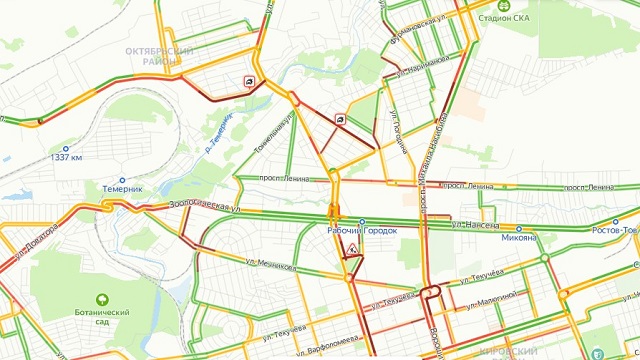 Наиболее сильные заторы образовались на центральных магистралях города —Нагибина, Вавилова, Космонавтов, Стачки, Малиновского, Ленина, Красноармейской, Ворошиловском и Будённовском. Фактически движение в центре Ростова сейчас почти парализовано.