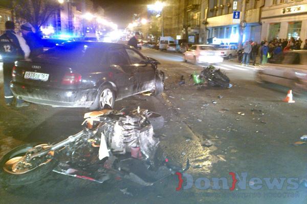Во вторник, 21 апреля, около 20:30, в самом центре Ростова, на пересечении Ворошиловского и Пушкинской, произошло крупное ДТП, участниками которого стали два мотоциклиста.