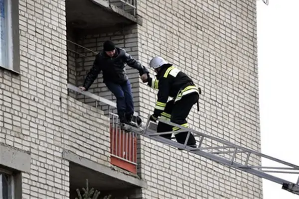 С другой стороны дома гостям продемонстрировали ещё один способ эвакуации — с помощью автолестницы. Но тут произошла заминка: человек в гражданской одежде, едва ступив на вибрирующую лестницу, дёрнулся обратно на балкон; затем сделал вторую попытку, но с тем же успехом; и лишь с третьего раза всё получилось так, как и было задумано — раненый и два его спасителя спиной вперёд спустились на землю.