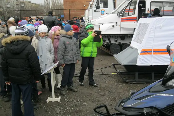 Молодых зрителей — учащихся близлежащей школы — привлёк снегоход. Младая поросль облепила Yamaha и стала снимать его на планшетники и мобильные телефоны.