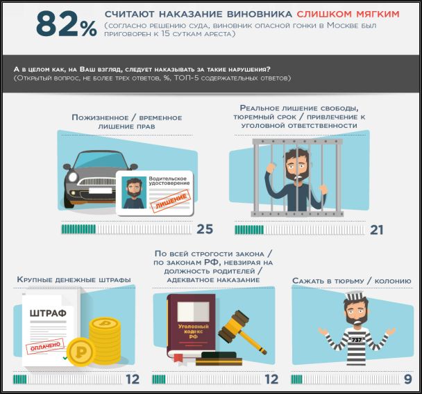 Наиболее справедливой мерой наказания для таких нарушителей чаще всего называли лишение водительских прав на всю жизнь или временно. Так полагают 25% опрошенных. В свою очередь, 21% считает, что по нарушителям плачет тюрьма, а ещё 12% отметили, что к тюремному сроку нелишним будет присовокупить внушительный штраф.