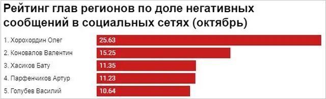 Ухудшились позиции Василия Голубева и в рейтинге по доле позитивных упоминаний в социальных сетях. В сентябре он занимал 59-ю строчку рейтинга, а в октябре опустился на 66-е место из 85.