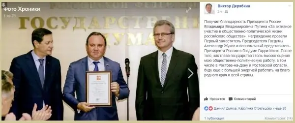 «После того, как глава государства столь высоко оценил мою общественно-политическую работу, в том числе в Ростове и Ростовской области, буду ещё с большей энергией работать на благо родного края и всей страны», — пообещал Виктор Дерябкин подписчикам своего аккаунта в Facebook.