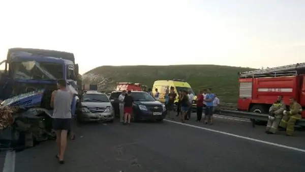 По данным пресс-службы ГУ МВД по Воронежской области, 42-летний водитель «Камаза» врезался в идущие впереди в южном направлении восемь легковых машин и один грузовик. По предварительным данным, причиной массового ДТП стало оторвавшееся колесо у «Камаза». По другой версии, у большегруза произошло что-то с тормозами.
