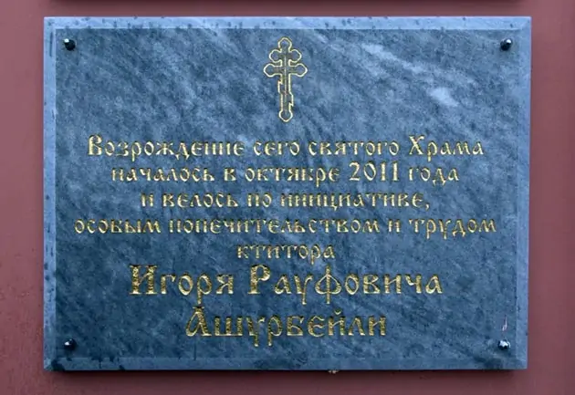 По инициативе Игоря Ашурбейли на стене храма была установлена мемориальная доска. Это — дань памяти священникам Иоанну Сноведскому и Михаилу Знаменскому, которые пострадали в годы репрессий. Их имена выбиты на сером граните.