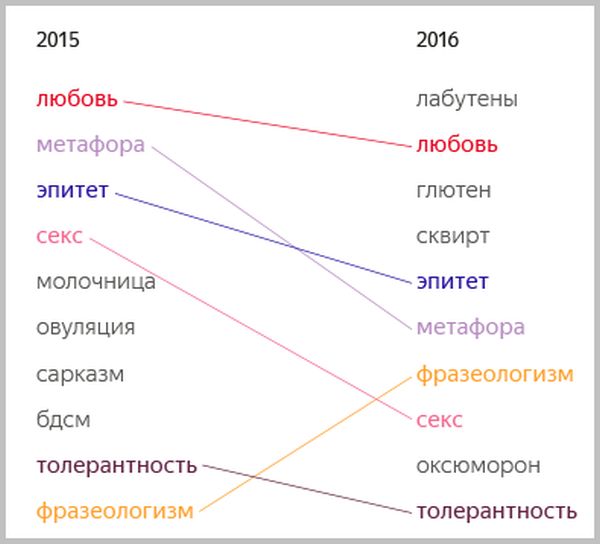 Десятка наиболее часто запрашиваемых слов за год изменилась на 40%. С 2015 года не пропал интерес к словам «любовь», «метафора», «эпитет», «секс», «толерантность» и «фразеологизм». А вместо «молочницы», «сарказма», «овуляции» и «БДСМ» (ролевые игры) появились «лабутены», «глютен», «сквирт» и «оксюморон».
