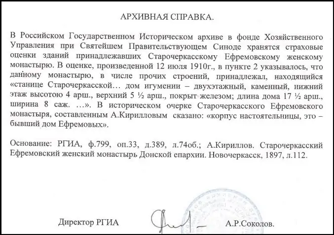 Но самое любопытное даже не это. В справке, представленной епархией, есть выдержка из очерка Кириллова. В ней говорится, что «монастырь прирос площадями — это дом настоятельницы, бывший дом Ефремовых». На этом цитата обрывается. По словам Ирины Чебатуровой, она обратилась в Государственный исторический архив, чтобы получить подтверждение того, что фраза оборвана и имеет продолжение, в котором утверждается, что в этом доме и в то время проживали родственники Ефремовых.