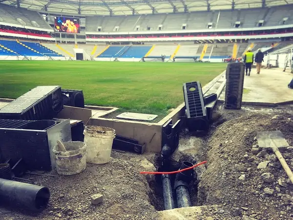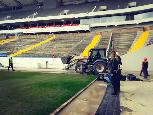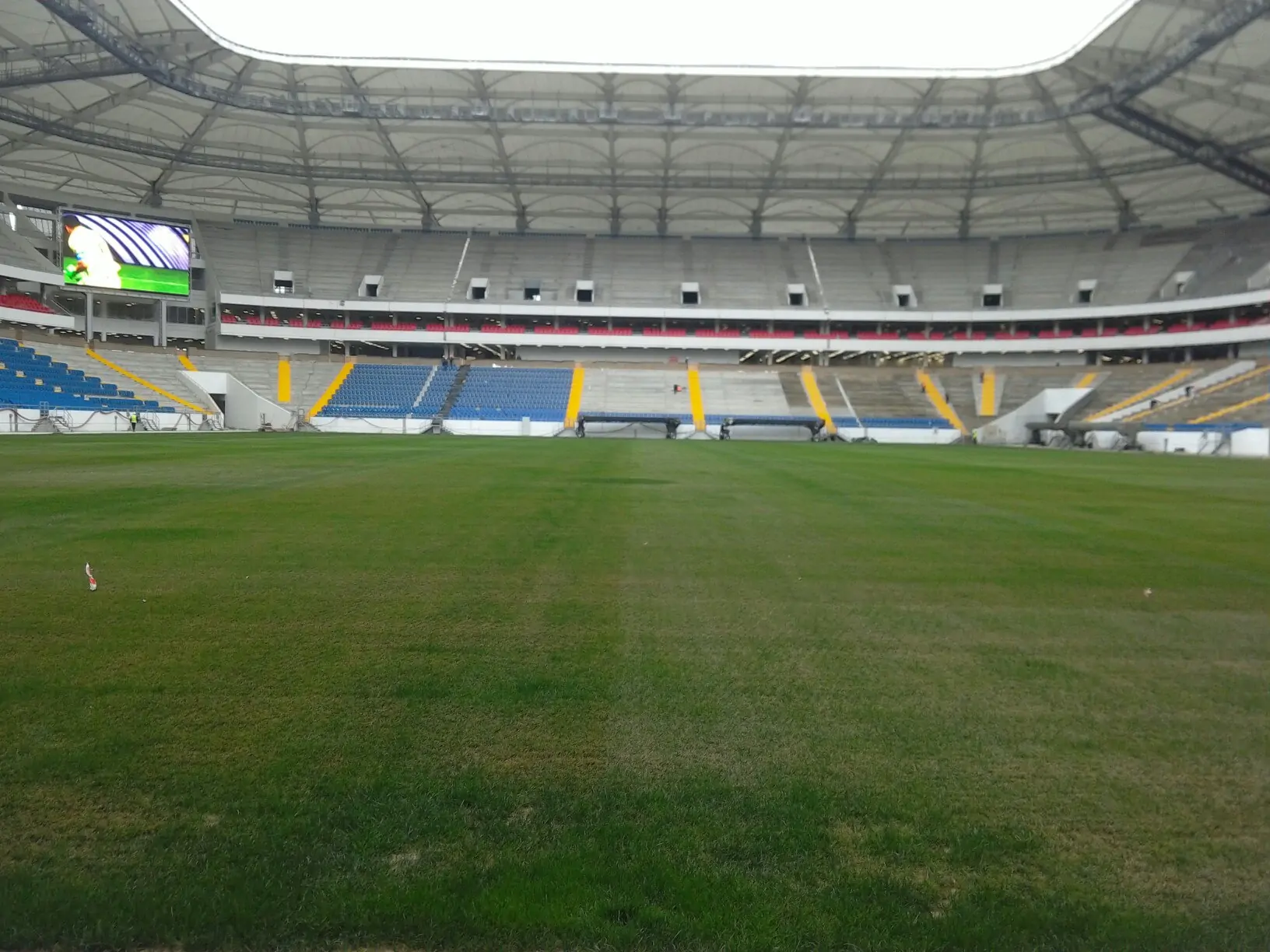 На самой арене работа кипит 24 часа в сутки. Идёт отделка внутренних помещений. Смонтированы несколько тысяч сидений, причём красные кресла для VIP-ложи готовы почти полностью.