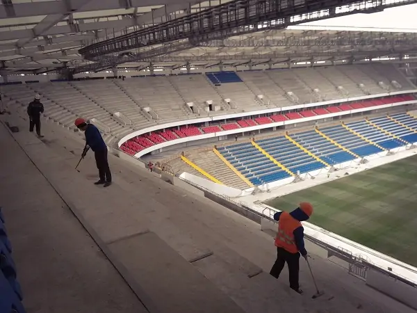Перед прибытием инспекции FIFA рабочие принялись усиленно подметать верхние трибуны.