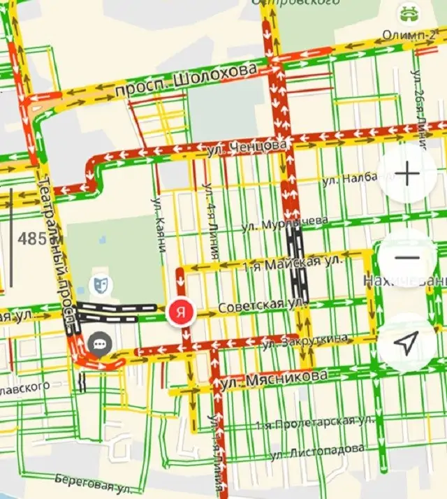 Часть машин объезжает Театральную площадь по улице Закруткина, часть — по Горького и Ченцова, пишет «Ростов-Транспорт». При этом жители Нахичевани из-за ограничений остались практически без транспорта.
