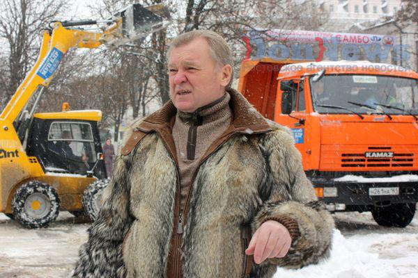 Возле здания мэрии журналистов встретил Владимир Арцыбашев, по случаю непогоды облачённый в меховую куртку.