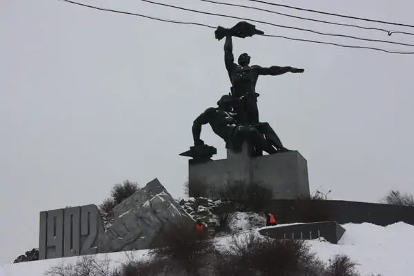 Говоря об этом, он указал на работающую на заднем плане технику, а также на дворников, работающих на самом памятнике Стачке 1902 года.